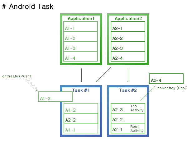 - Task는 어플리케이션에서 실행되는 액티비티를 보관하고 관리하며 Stack형태의 연속된 Activity로 이루어진다